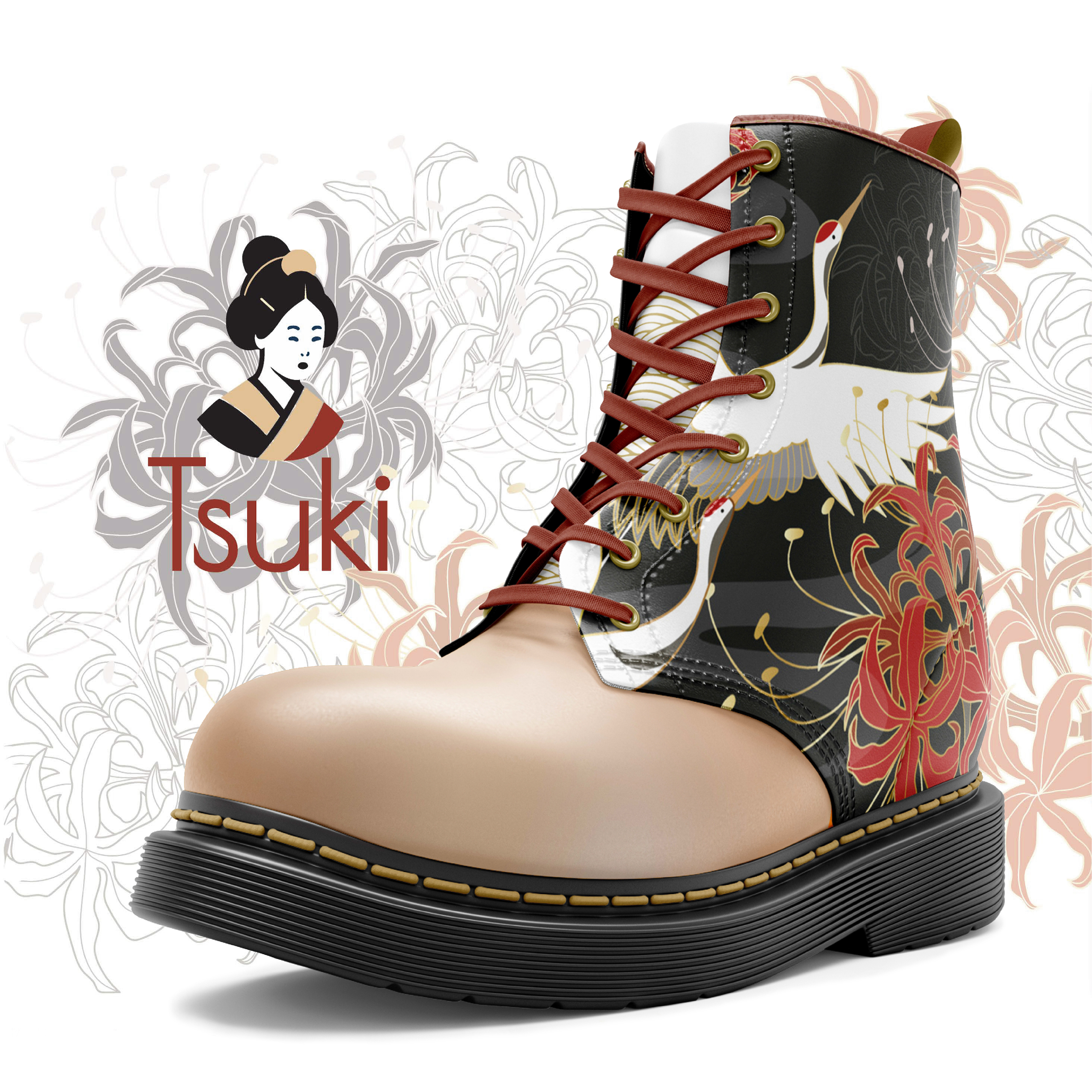 This custom boot design for Tsuki blends traditional Japanese aesthetics with contemporary streetwear style. The design features elegant red-crowned cranes in flight, surrounded by flowing chrysanthemums—symbols of longevity and renewal in Japanese culture.