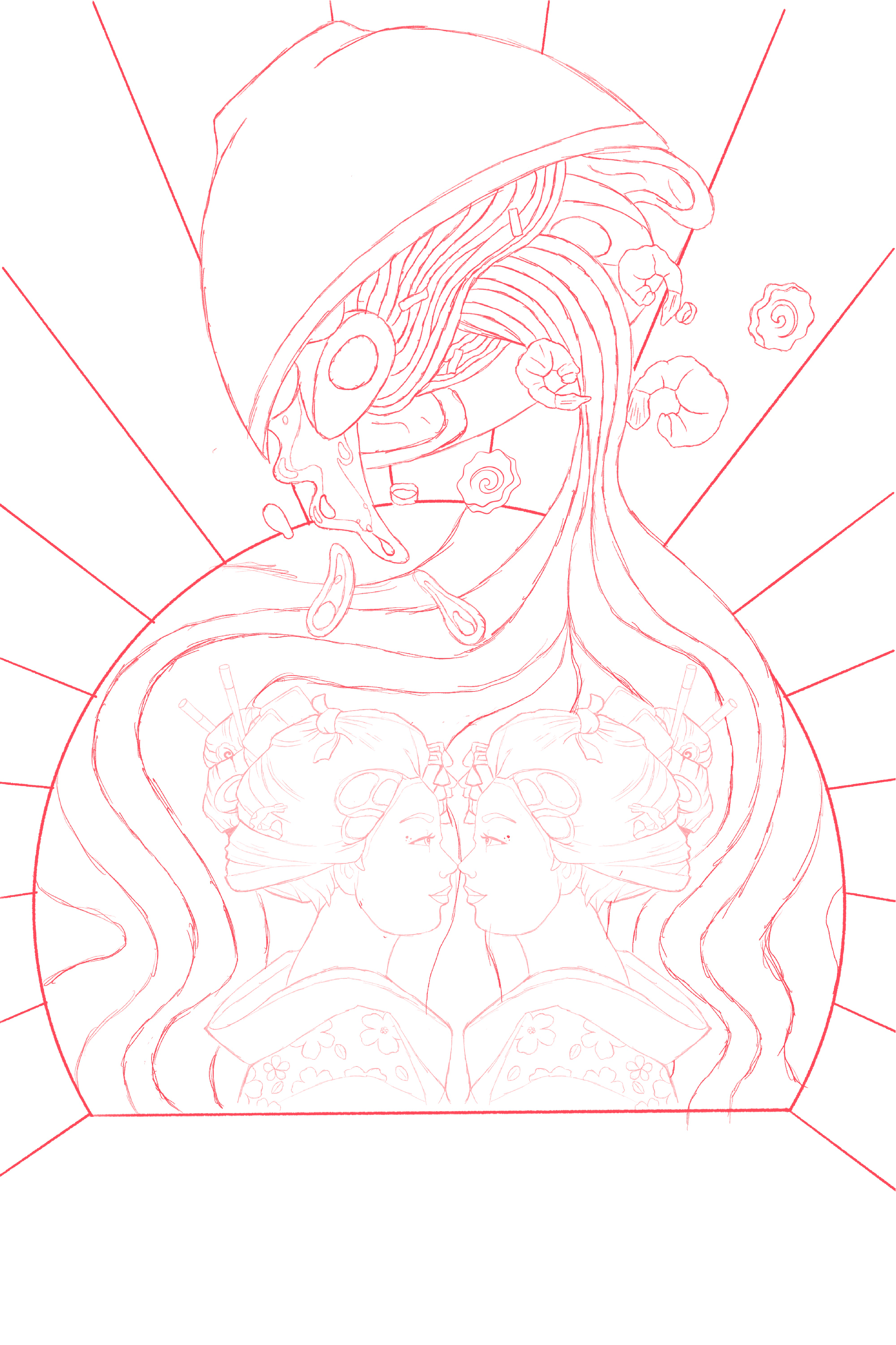 Cosmic Ramen is a visually explosive t-shirt and brand artwork created for a ramen company that refuses to stay inside the bowl. Channeling the vibrant chaos of 1960s psychedelic art, this piece features two mirrored geishas wrapped in cosmic swirls of noodles, shrimp, and broth, cascading from a celestial ramen bowl.