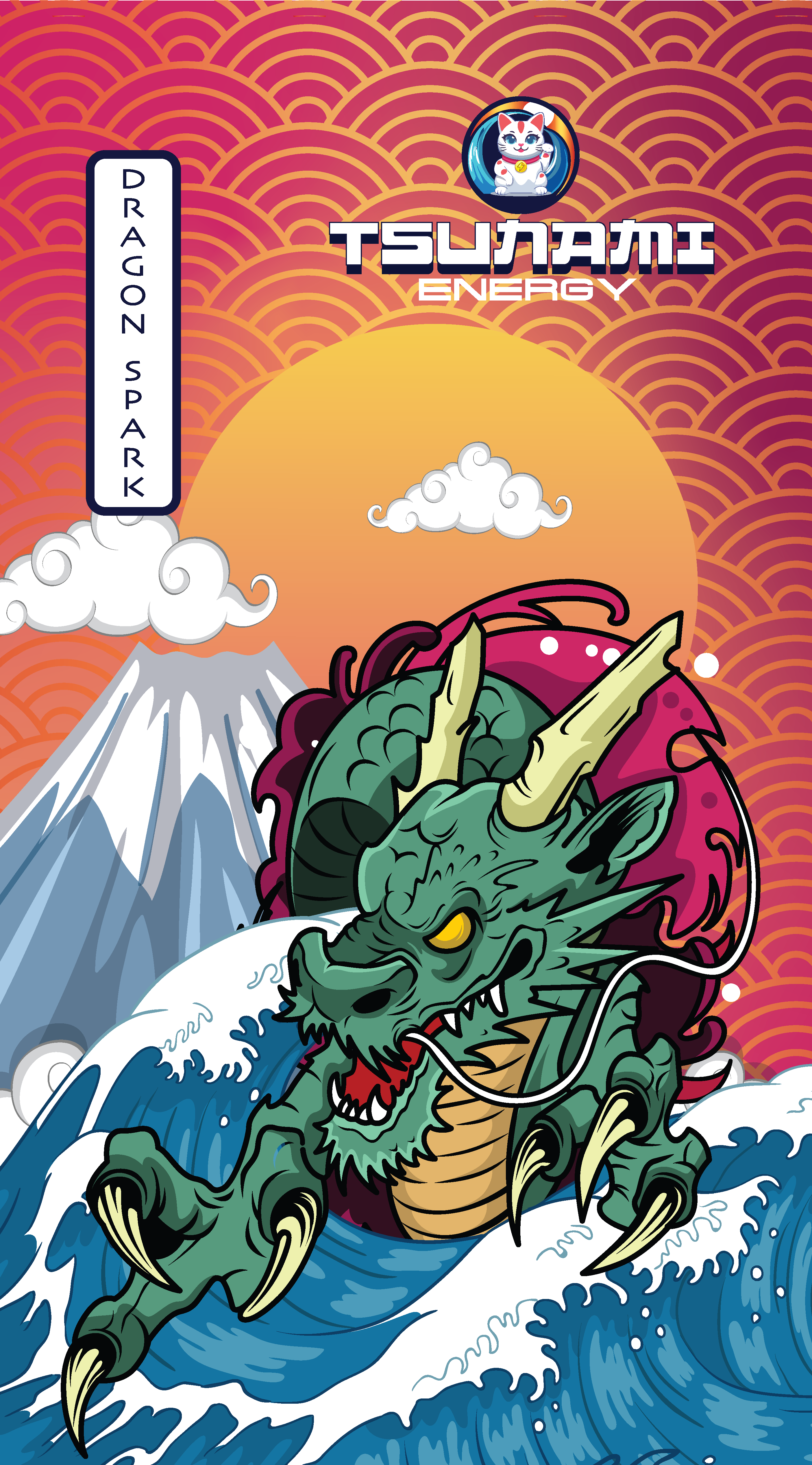 These two can designs were created for Tsunami Energy’s limited-edition flavors: Sakura Citrus and Dragon Spark. Each design draws inspiration from traditional Japanese art, blending cultural symbolism with bold, modern illustration.